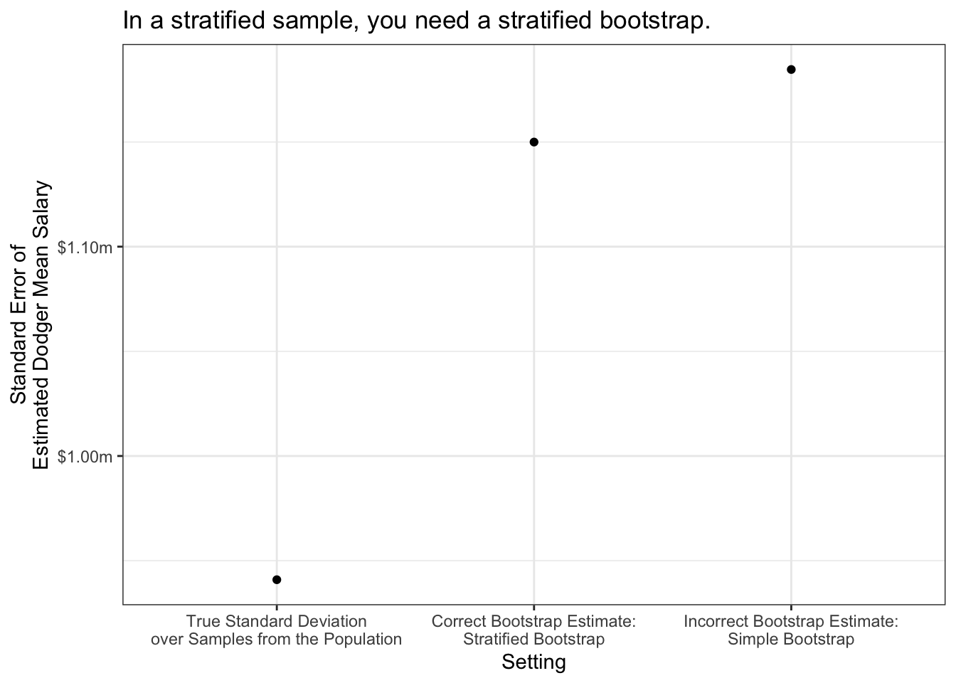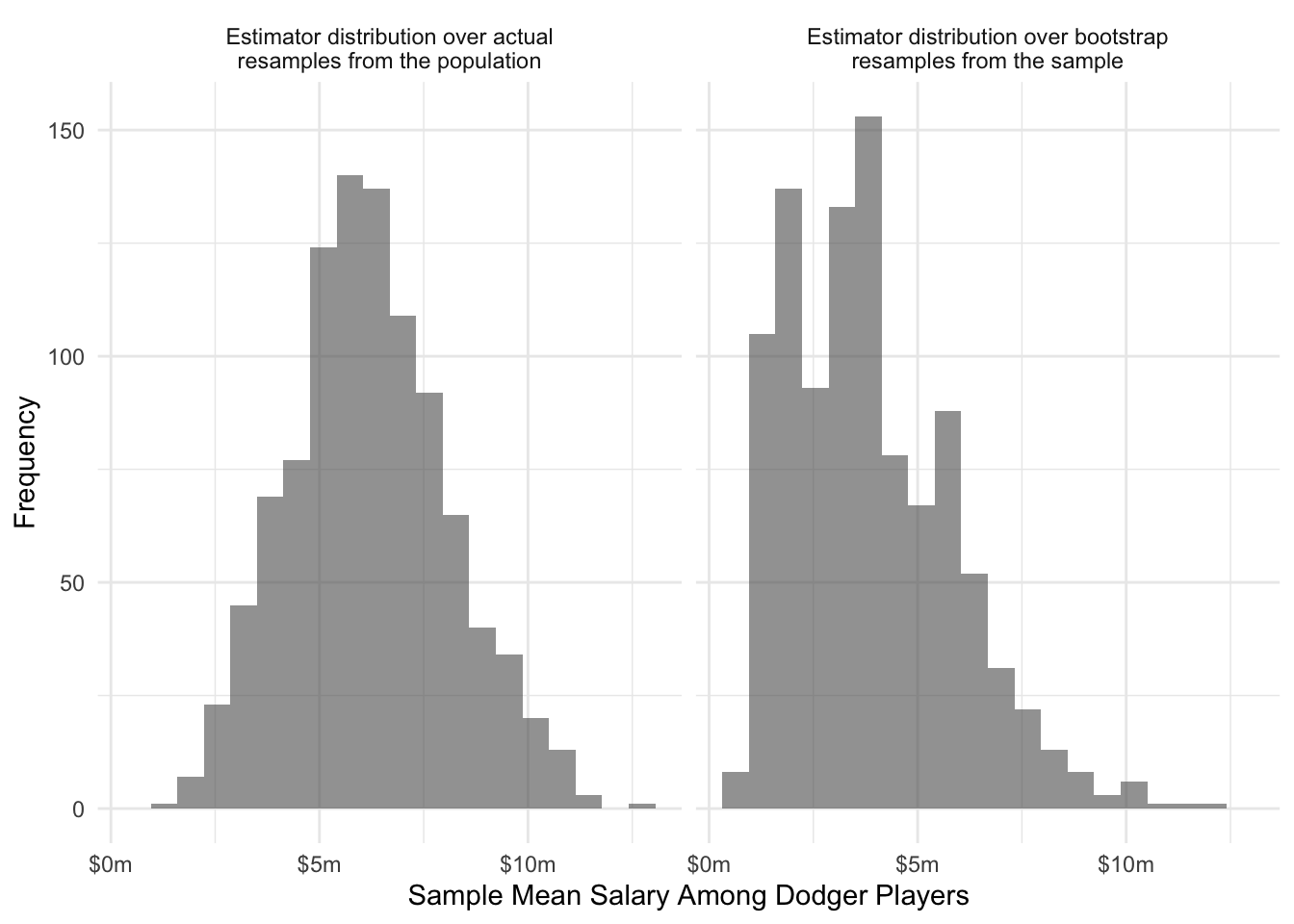 \[ \widehat{\text{SD}}(s) = \frac{1}{B-1}\sum_{r=1}^B \bigg(s(\texttt{data}^*_r) - s(\texttt{data}^*_\bullet)\bigg)^2 \] where \(s(\texttt{data}^*_\bullet)\) is the mean of the estimate across the bootstrap samples. Note that just like the analytic standard errors, these have also relied on a plug-in principle: we plugged in the empirical distribution \(\hat{F}\) for the population distribution \(F\) when generating bootstrap samples from our empirical data instead of actual samples from the population.
