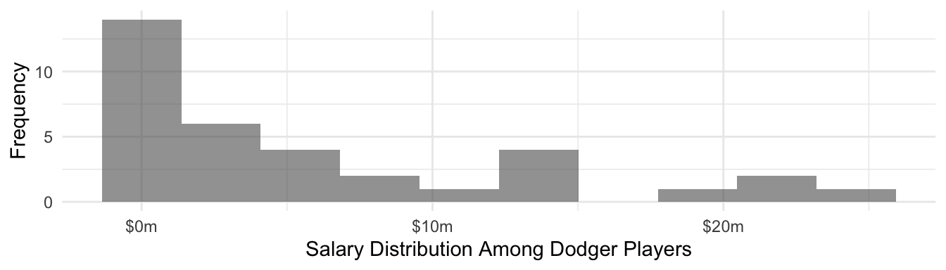 You might be concerned: can a Normal distribution be a good approximation when Dodger player salaries are highly right-skewed? After all this is the distribution of Dodger player salaries.