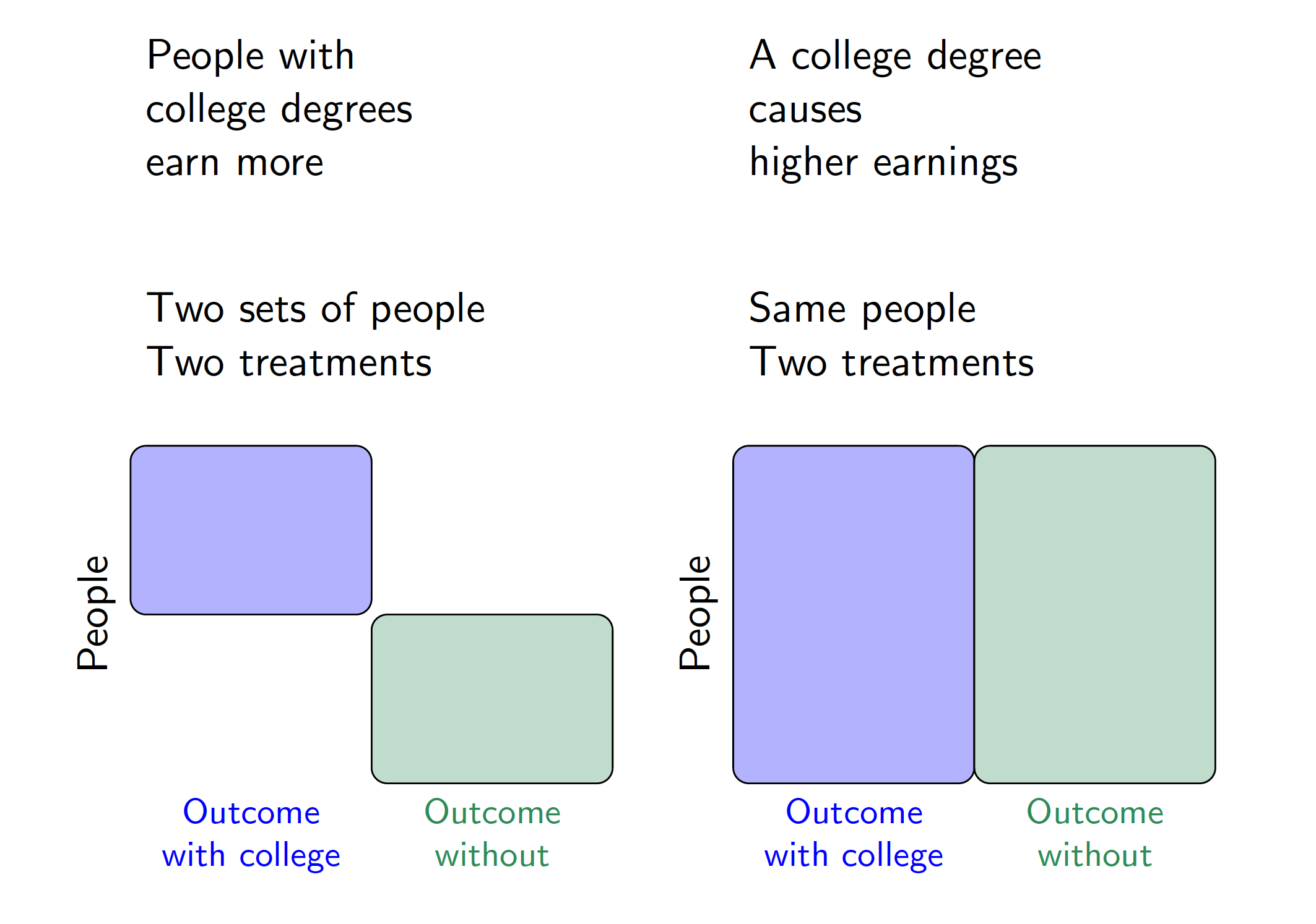 The mathematical statement \[ E\left(\text{Earning}^{\text{CollegeDegree} = \texttt{TRUE}}\right) > E\left(\text{Earning}^{\text{CollegeDegree} = \texttt{FALSE}}\right) \] is a causal claim that the expected value of earnings that a random person would realize if assigned to a college degree is higher than the expected value if a random person were assigned to no college degree. Because there is no vertical bar (\(\mid\)), the causal claim is an average over the entire population on both sides of the inequality. The descriptive claim, by contrast, is an average over two different sets of units. The figure below visualizes the difference between these descriptive and causal claims using a visual analogous to the one used to introduce a Mediterranean diet.