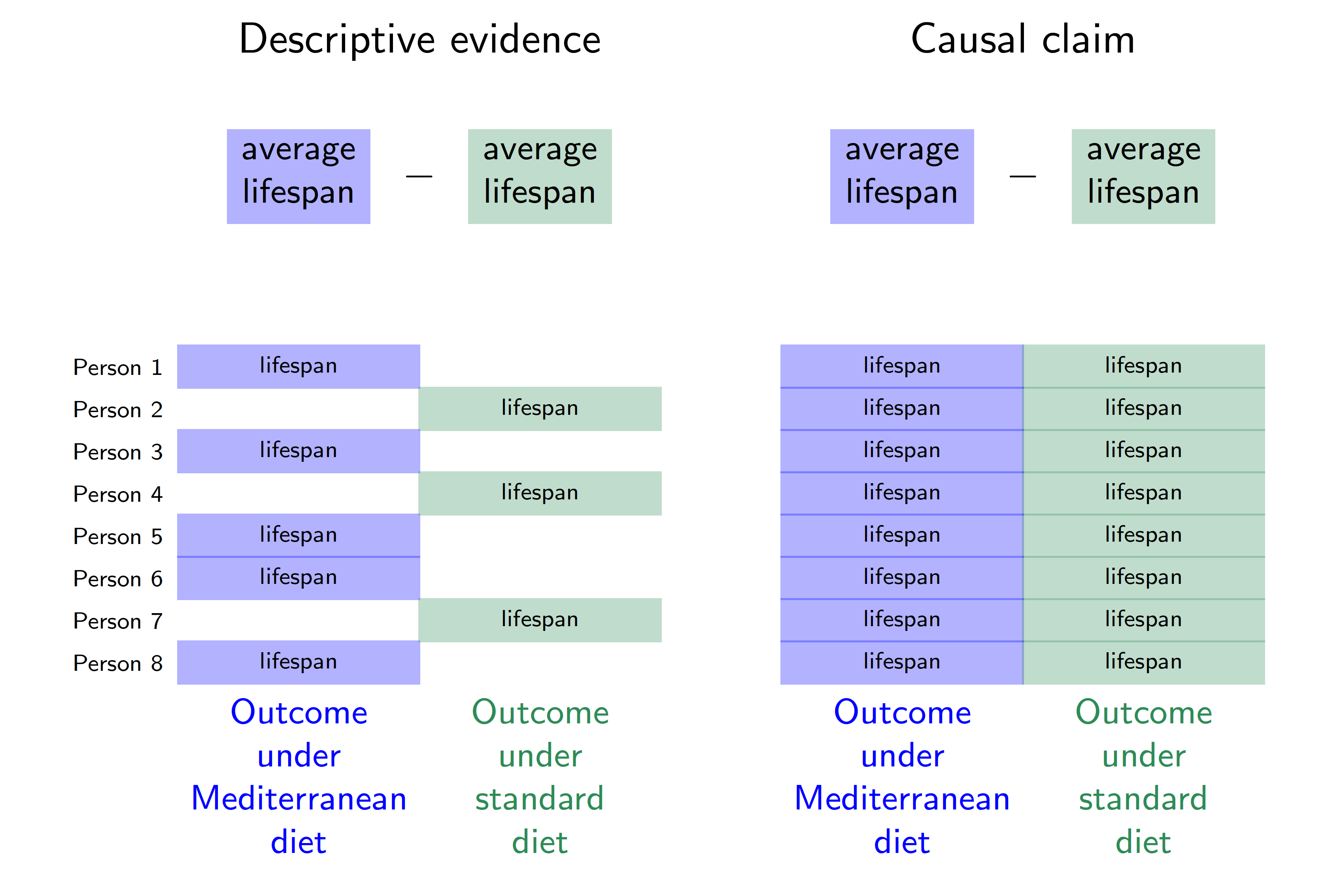 In this hypothetical example, each row corresponds to a person. Person 1 follows a Mediterranean diet and is observed to have a lifespan indicated in blue. Person 2 does not follow a Mediterranean diet and is observed to have a lifespan indicated in green. The descriptive evidence is that lifespans are longer among those eating a Mediterranean diet (blue outcomes on the left) compared with those eating standard diets (green outcomes on the left).