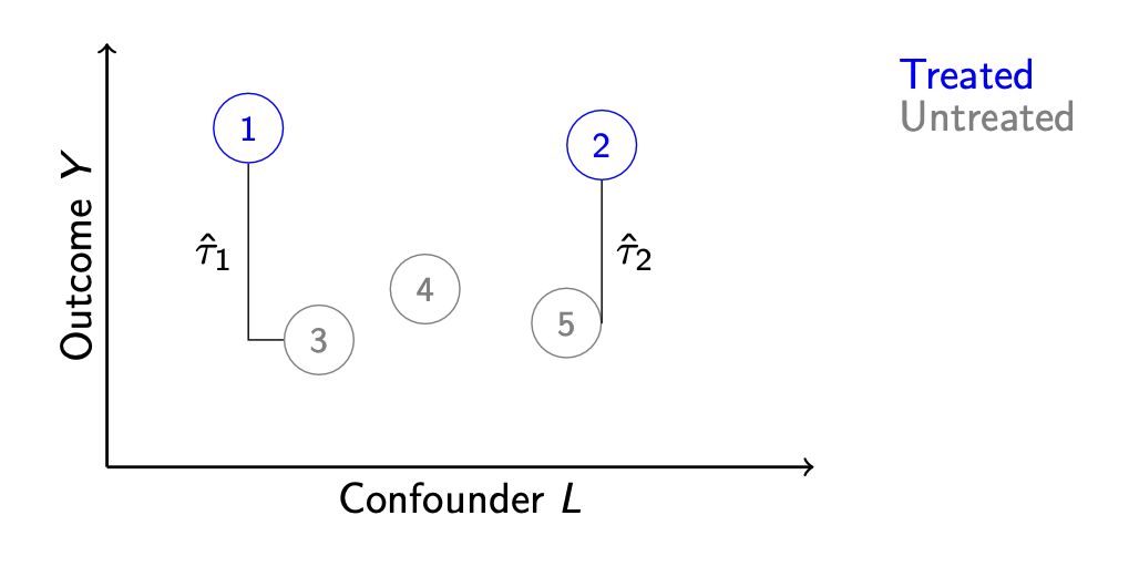 Another strategy might involve no model at all. We notice that unit 3 is very similar to unit 1 along \(L\). Likewise, unit 2 is very similar to unit 5. We could match these units together and use the matches to infer the unobserved potential outcomes.