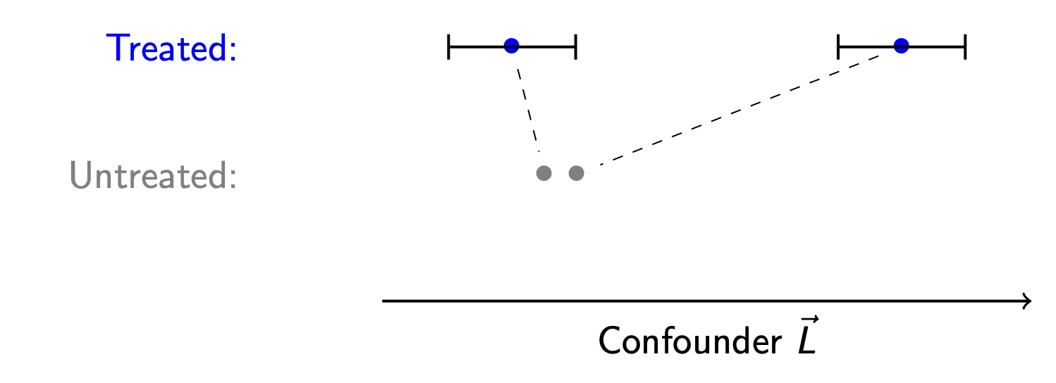 Below are two treated and two untreated units who differ on one confounding variable \(L\). The left-most treated unit is matched to the left-most control unit. The algorithm then moves to the right-most treated unit: which control unit should serve as its match?
