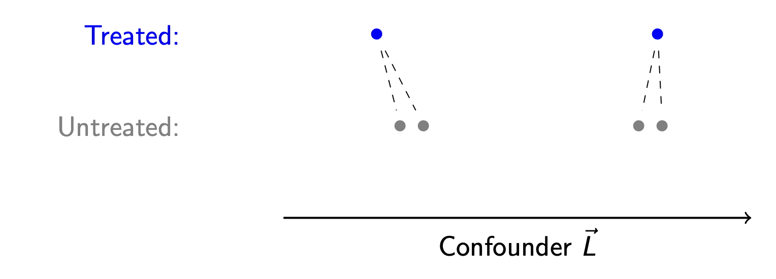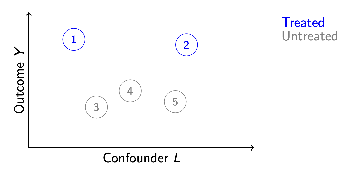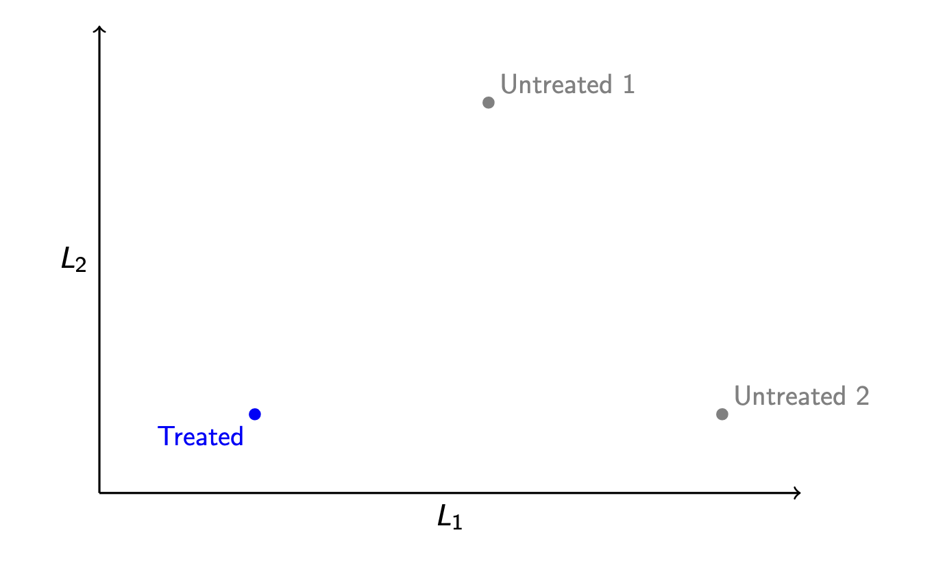 Suppose we have treated and untreated units that differ along two confounding variables, \(L_1\) and \(L_2\).