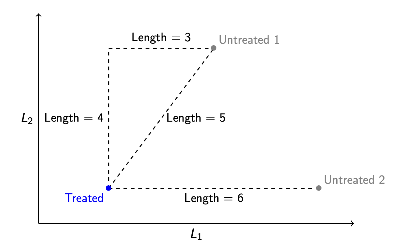 By Manhattan distance, we might determine that the unit (Untreated 2) is closest to (Treated) because its Manhattan distance from the treated unit is 6 instead of 7.