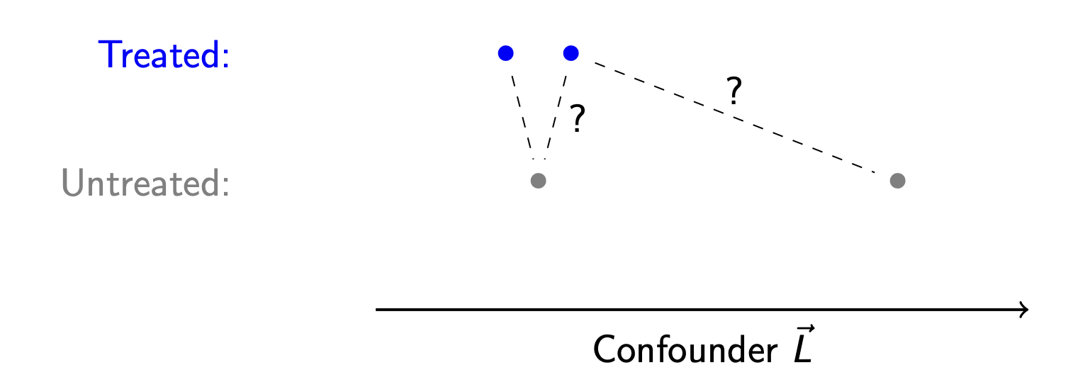 One way to draw inference is by a model: model \(Y^0\) as a function of \(L\) among the untreated units, and then use our model to predict for the treated units.