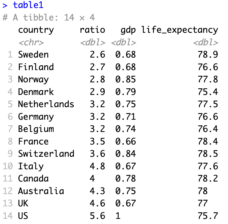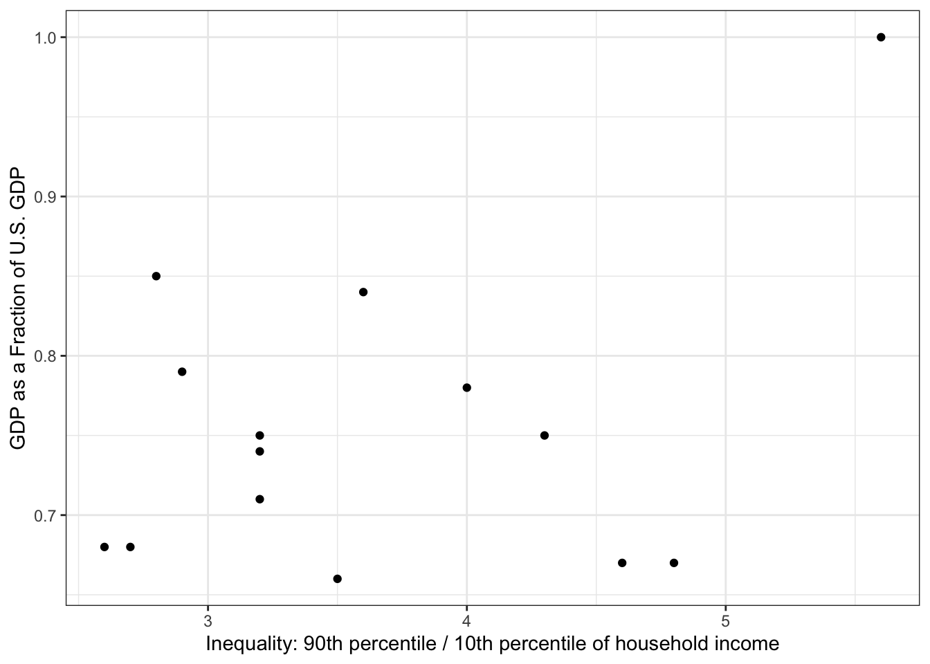 data = table1says that data will come from the objecttable1mapping = aes(x = ratio, y = gdp)maps the data to the aesthetics of the graph. This line says that theratiovariable will be placed on the \(x\)-axis and thegdpvariable will be on the \(y\)-axis.