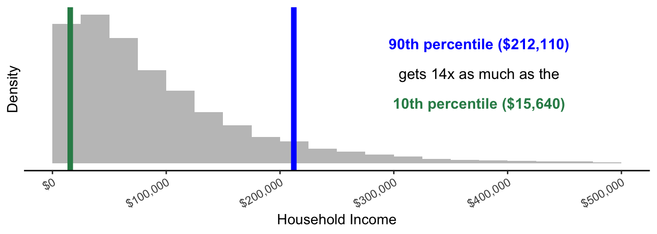 There are two summary statistics: the 90th percentile in blue and the 10th percentile in green. The 90th percentile is the income value such that 90% of households have incomes that are lower. 90% of the gray mass is to the left of the blue line. The 10th percentile is the income value such that 10% of households have incomes that are lower. We can think of the 90th percentile as a measure of a high income in the distribution and the 10th percentile as a measure of a low income in the distribution.