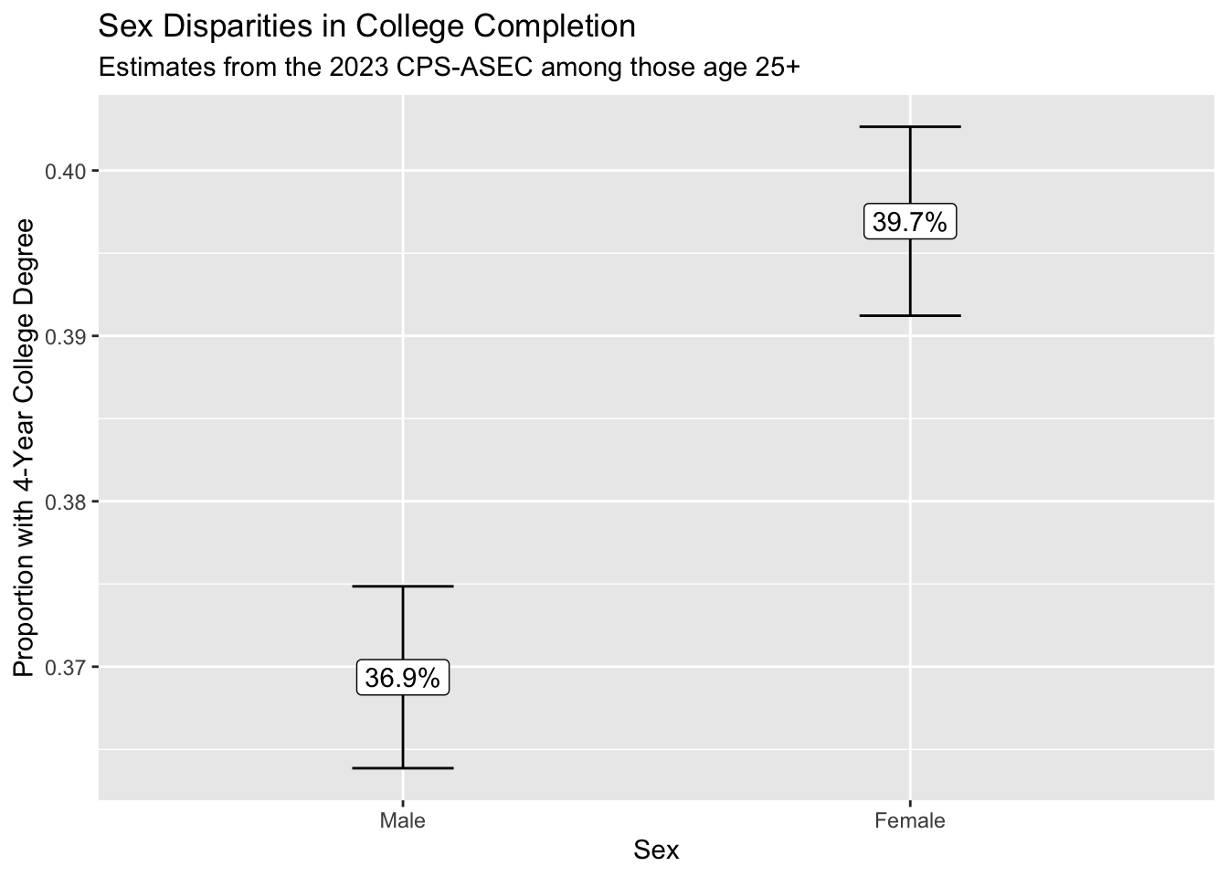 We conclude that those identifying as female are more likely to hold a college degree. Because we can see the confidence intervals generated using the replicate weights, we are reasonably confident in the statistical precision of our point estimates.