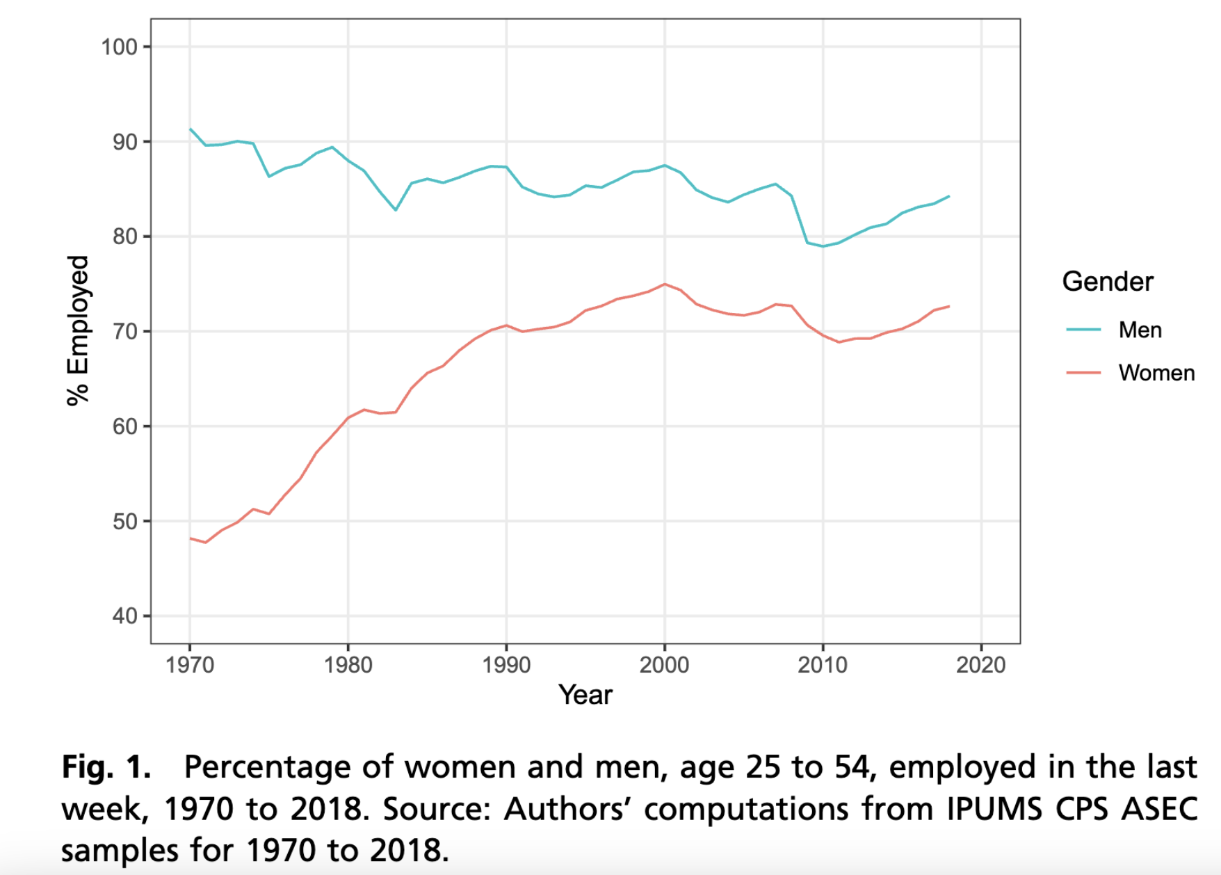 The measure of gender is limited in this study. In social science, sex typically refers to categories assigned at birth (e.g., female, male) while gender is a performed construct with many possible values: man, woman, non-binary, etc. Survey data often contain a variable named “sex” containing the values “male” or “female.” When studying sex/gender disparities over decades of history, this binary categorization is often the only measure available. Researchers often refer to them as “gender” because they are the best available measure that approximates gender. We expect improved measures of gender to become available in the future as quantitative research improves.↩︎