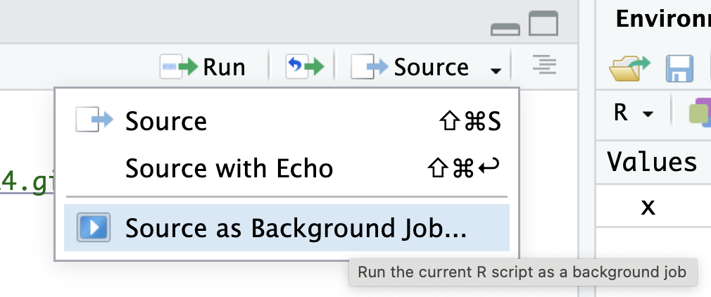 Test your code before submitting. To make sure your code will run from top to bottom, test it in a clean environment (where you have no packages loaded and no objects existing). One way to do this in RStudio is to click the the down arrow next to the Source button at the top of the script, then click “Source as Background Job.” Then click “Start.” The “Background Jobs” pane will open by your Console, and it will show errors if they appear.
