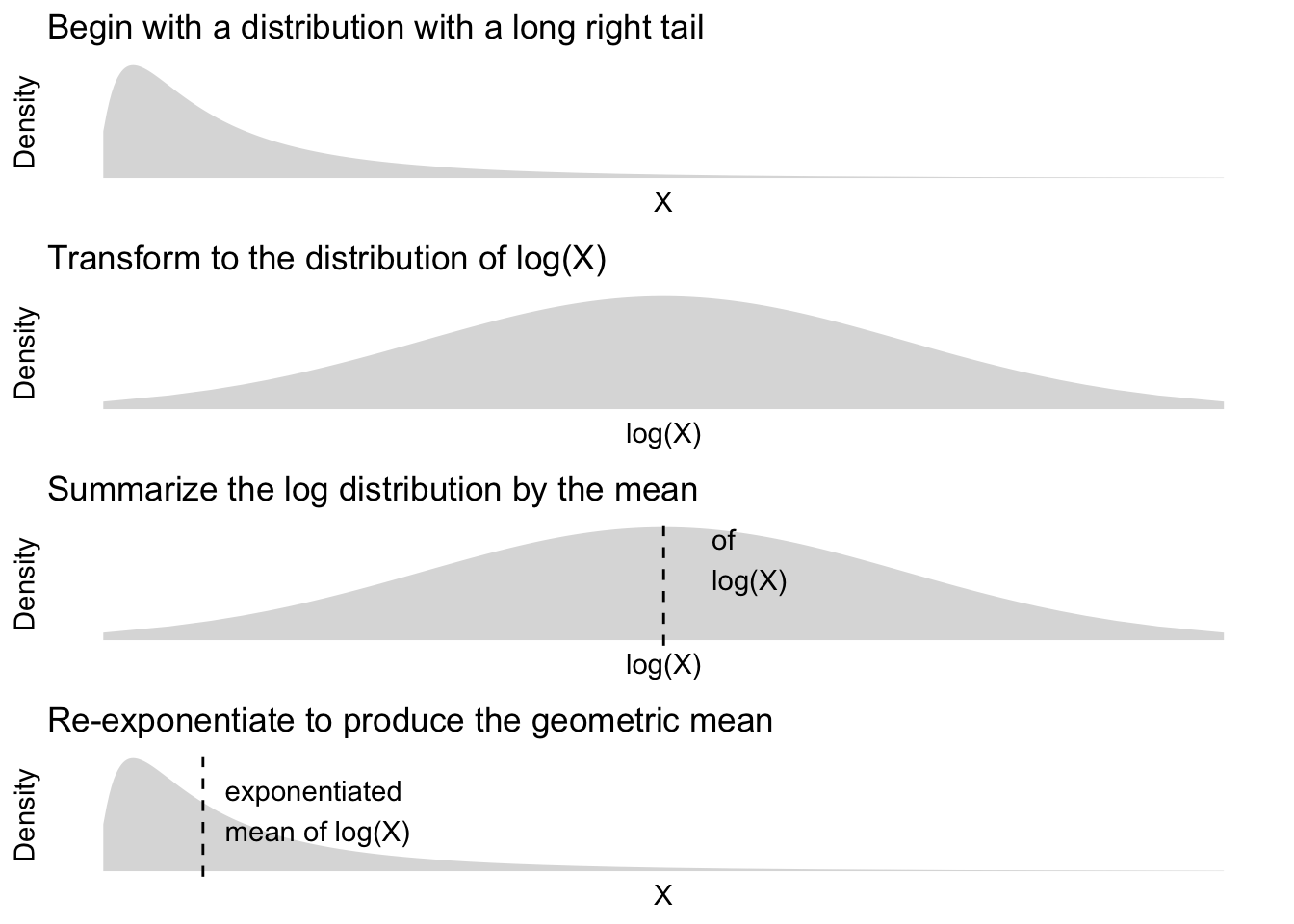 - Exponentiate the summary to move back to the scale of \(X\) (since \(e^{\text{log}(X)} = X\))