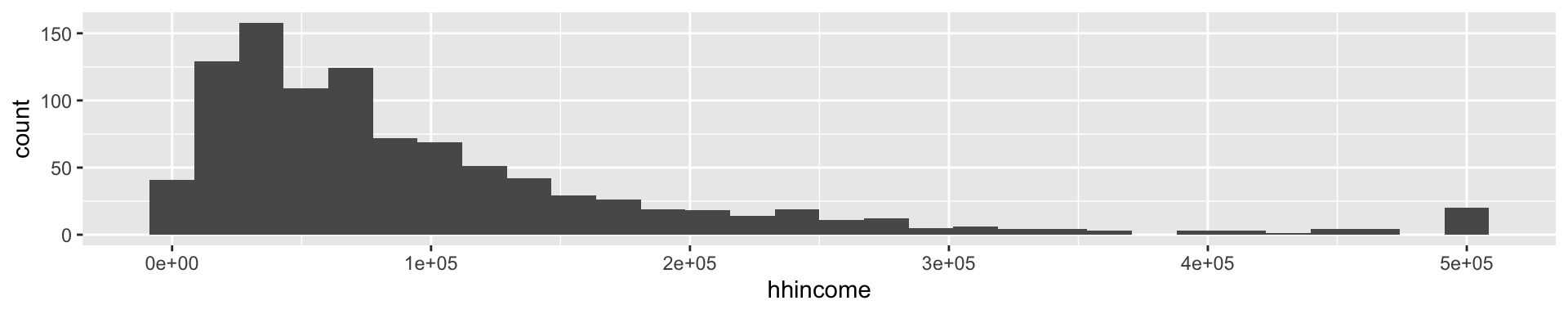 c(1,2,3) in the object numberslength() function to get the length of numbersggplot()summarize()|>How might we visualize the U.S. income distribution?