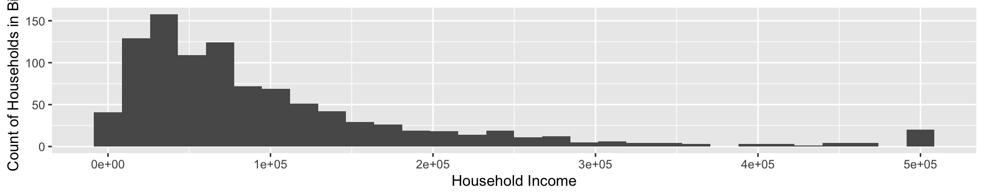 aes() defines the aesthetics of the plotgeom_histogram()+ indicates that a new layer is cominggeom_histogram() is the new layerdata and mapping of the plotggplot()summarize()|>| Household | Distribution 1 | Distribution 2 | Distribution 3 |