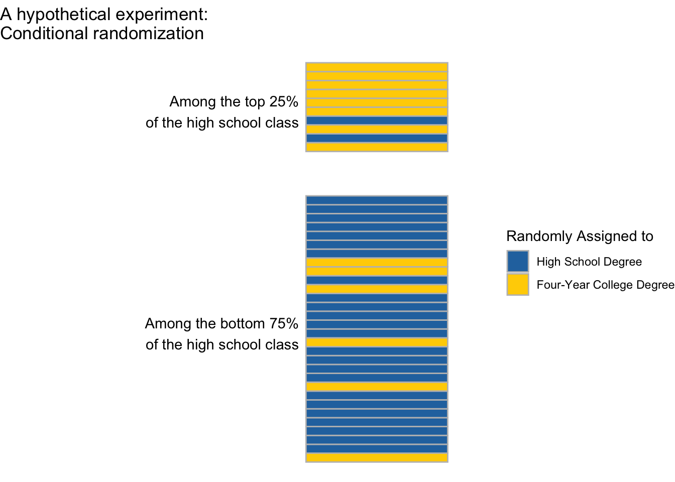 Even though exchangeability does not hold marginally (across everyone), in a conditionally randomized experiment exchangeability does hold within subgroups. If we focus on those in the top 25% of the class, the 90% who are assigned to finish college are a simple random sample of the entire higher-performing subgroup. If we focus on those in the bottom 75% of the class, the 10% who are assigned to finish college are a simple random sample of the entire lower-performing subgroup.