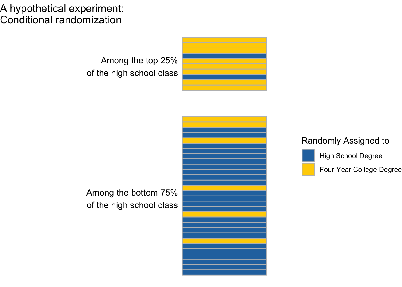Even though exchangeability does not hold marginally (across everyone), in a conditionally randomized experiment exchangeability does hold within subgroups. If we focus on those in the top 25% of the class, the 90% who are assigned to finish college are a simple random sample of the entire higher-performing subgroup. If we focus on those in the bottom 75% of the class, the 10% who are assigned to finish college are a simple random sample of the entire lower-performing subgroup.