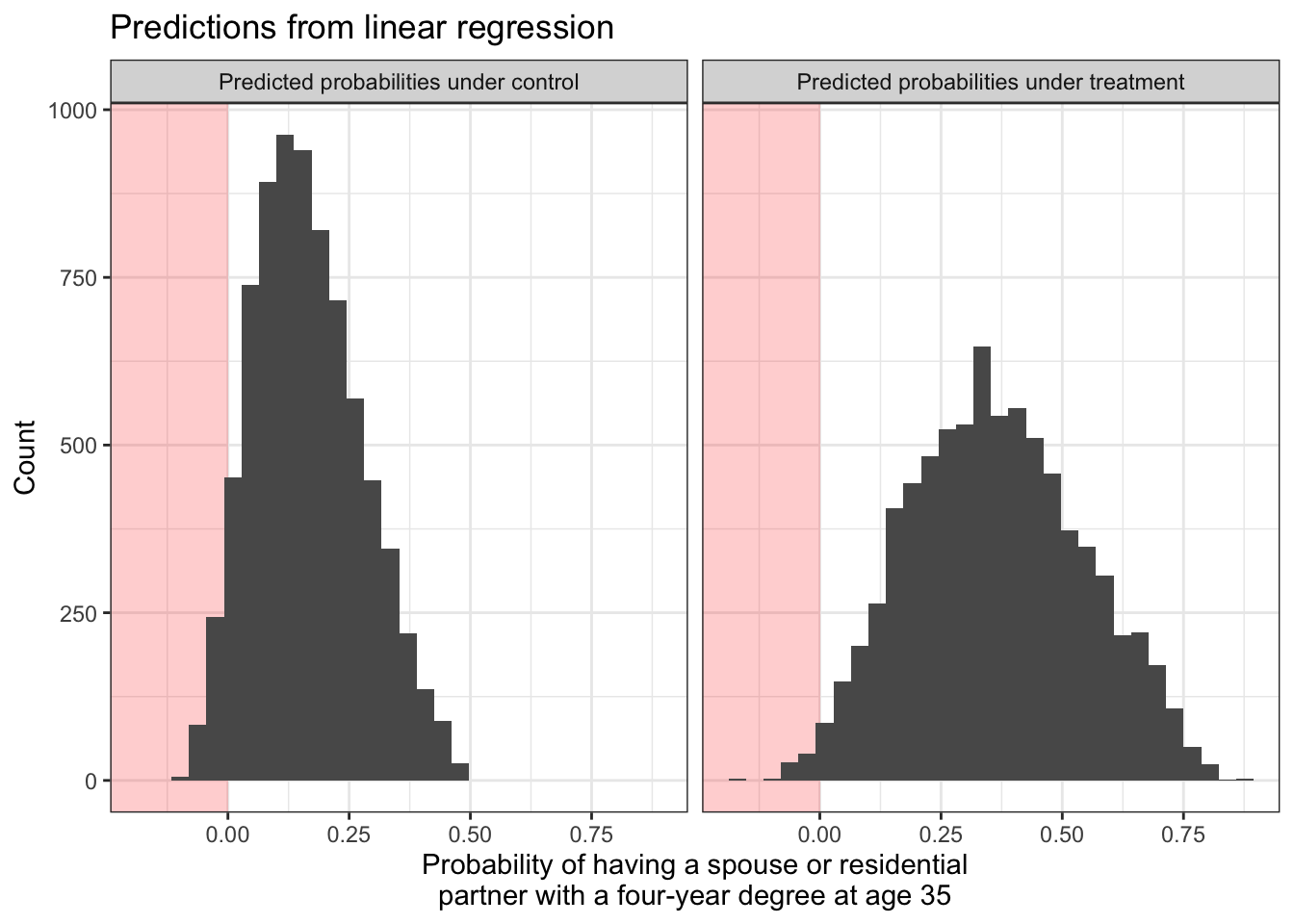 Both models are predicting that some people have negative probabilities of having a college-degree-holding spouse or partner! We might want to solve this by estimating logistic regression models. We do this with the glm() function with the argument family = binomial.