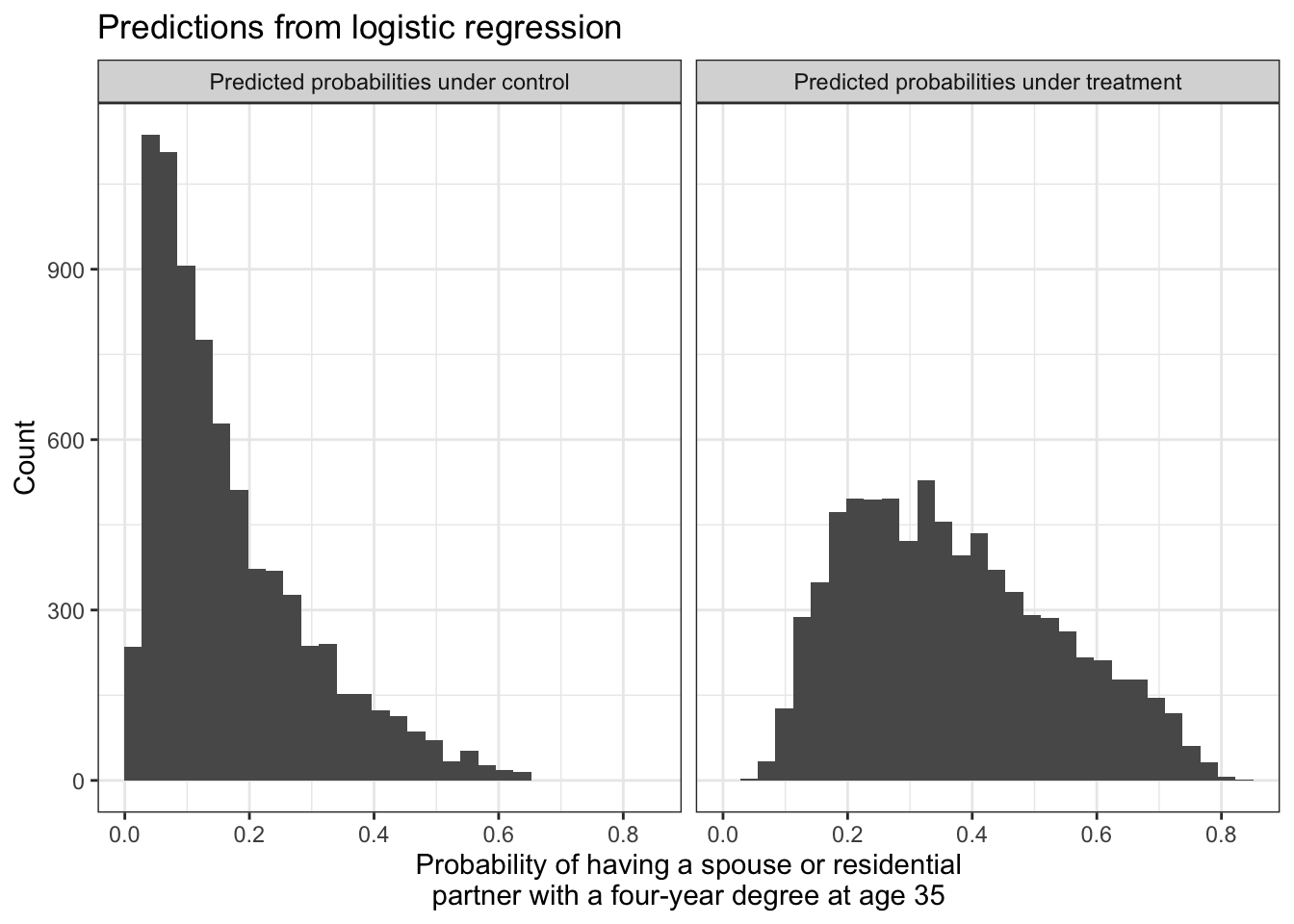 The type = "response" argument is essential, because this tells R to predict the probability of treatment instead of the log odds of treatment.