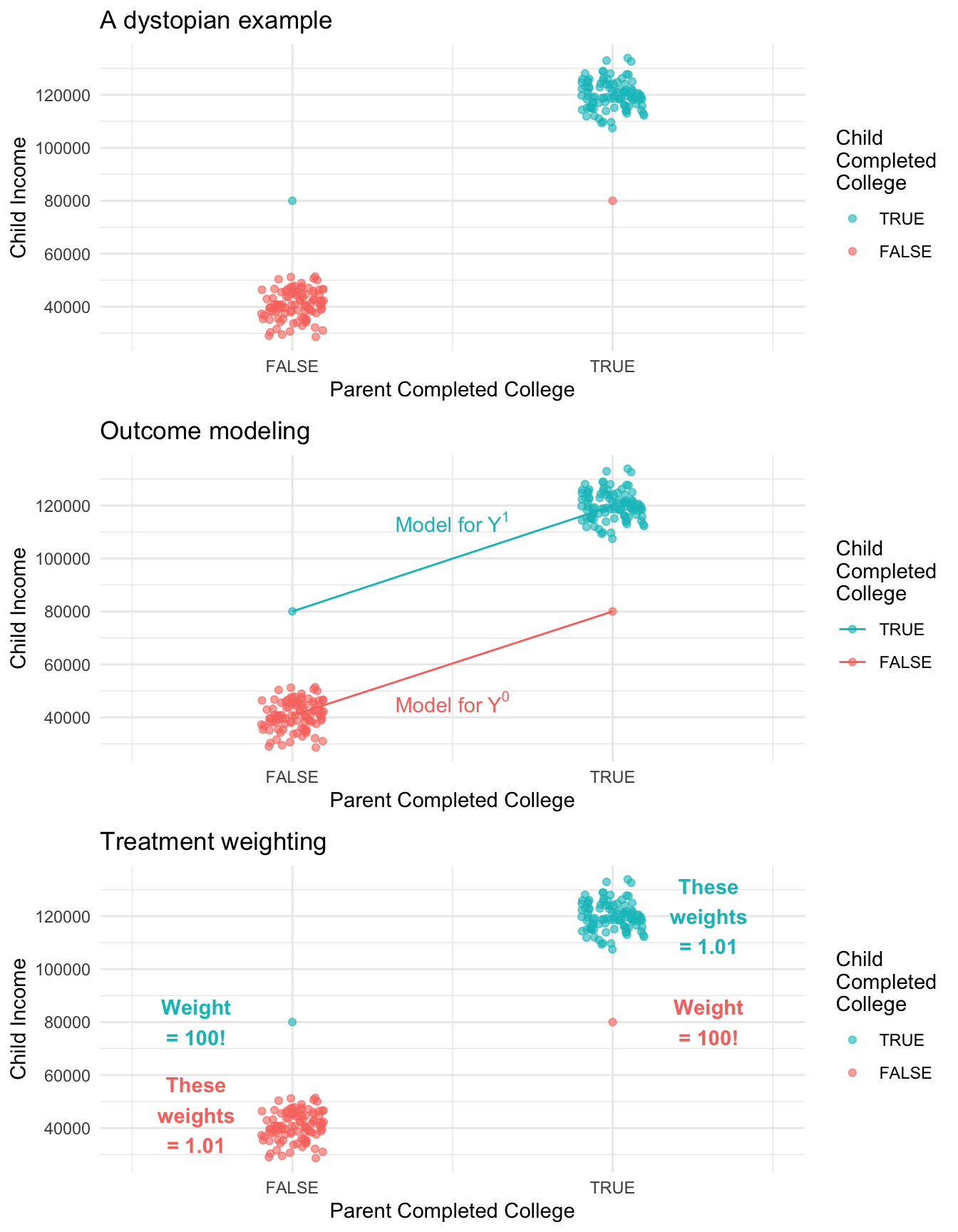 One argument in favor of treatment modeling is that it makes more transparent which units get a very large amount of weight. To illustrate this, the figure below shows a simulation in a very dystopian world. In this world, 99% of the children of college graduates complete college compared with only 1% of the children of non-graduates. We could fit an outcome model to predict each child’s future income under college (\(Y^1\)) and under no college (\(Y^0\)). Alternatively, we could estimate by inverse probability of treatment weights. An advantage of the treatment weighting is that we can see that two observations are very influential: the first-generation college graduate has a very unlikely treatment status, and counts for 100 people! Likewise the child of college graduates who did not make it through college has a weight of 100.