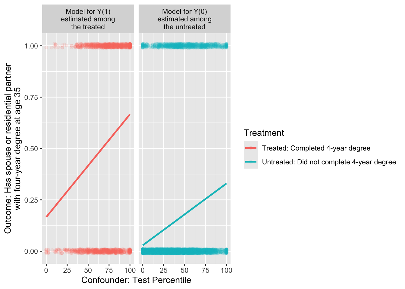 We first illustrate the steps as though there were only one confounding variable: test percentile. The first step is to create a data object containing only the treated observations and a data object containing only the untreated observations.