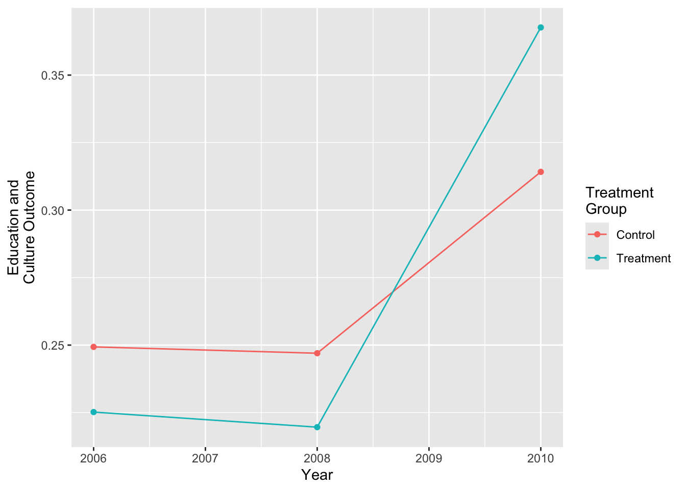 We will first estimate the mean value of the outcome (education_culture) within subgroups defined by treatment and year.