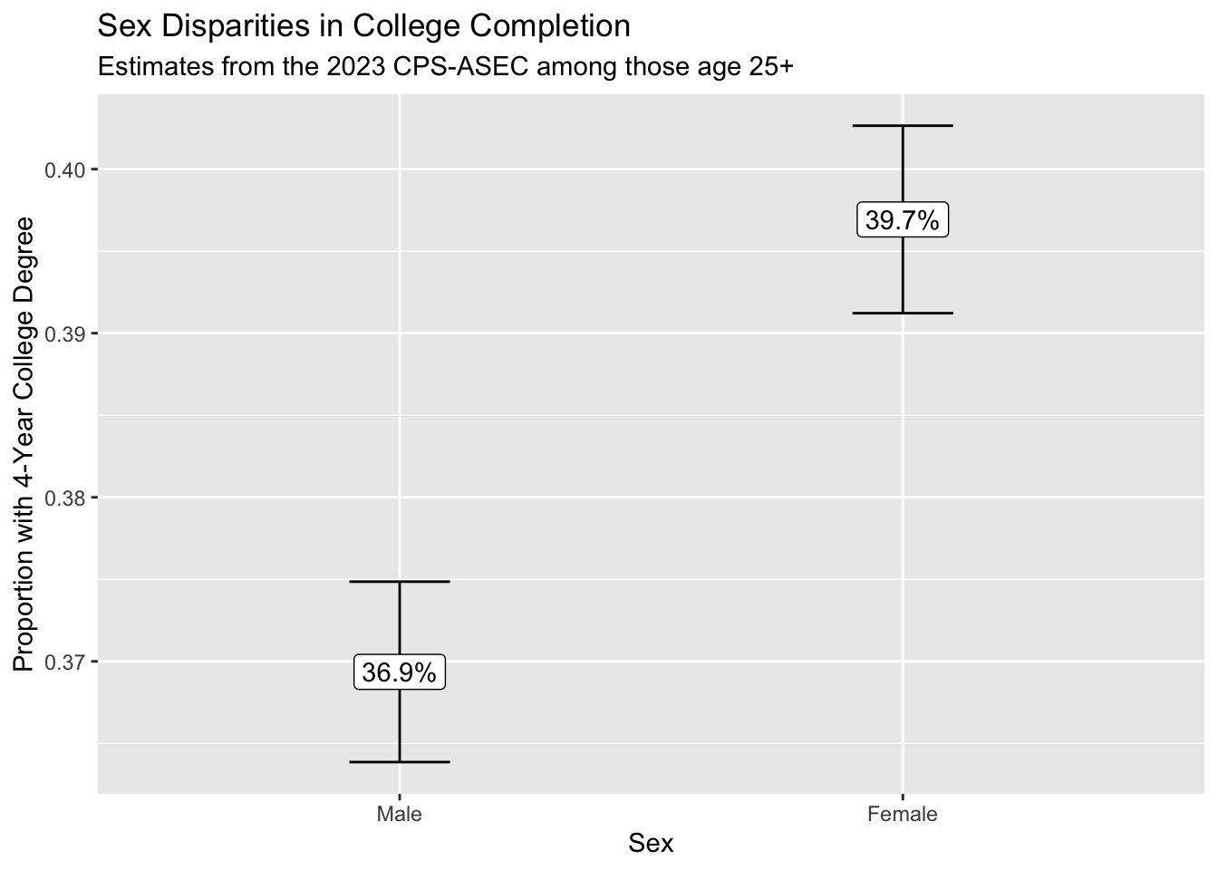 We conclude that those identifying as female are more likely to hold a college degree. Because we can see the confidence intervals generated using the replicate weights, we are reasonably confident in the statistical precision of our point estimates.
