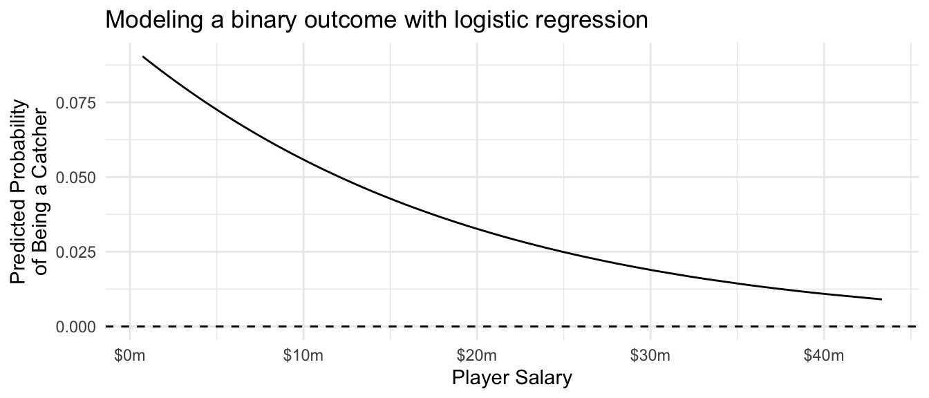 Suppose we model the probability that a player is a catcher (position == "C") as a linear function of player salary. For illustration, we do this on the full population.