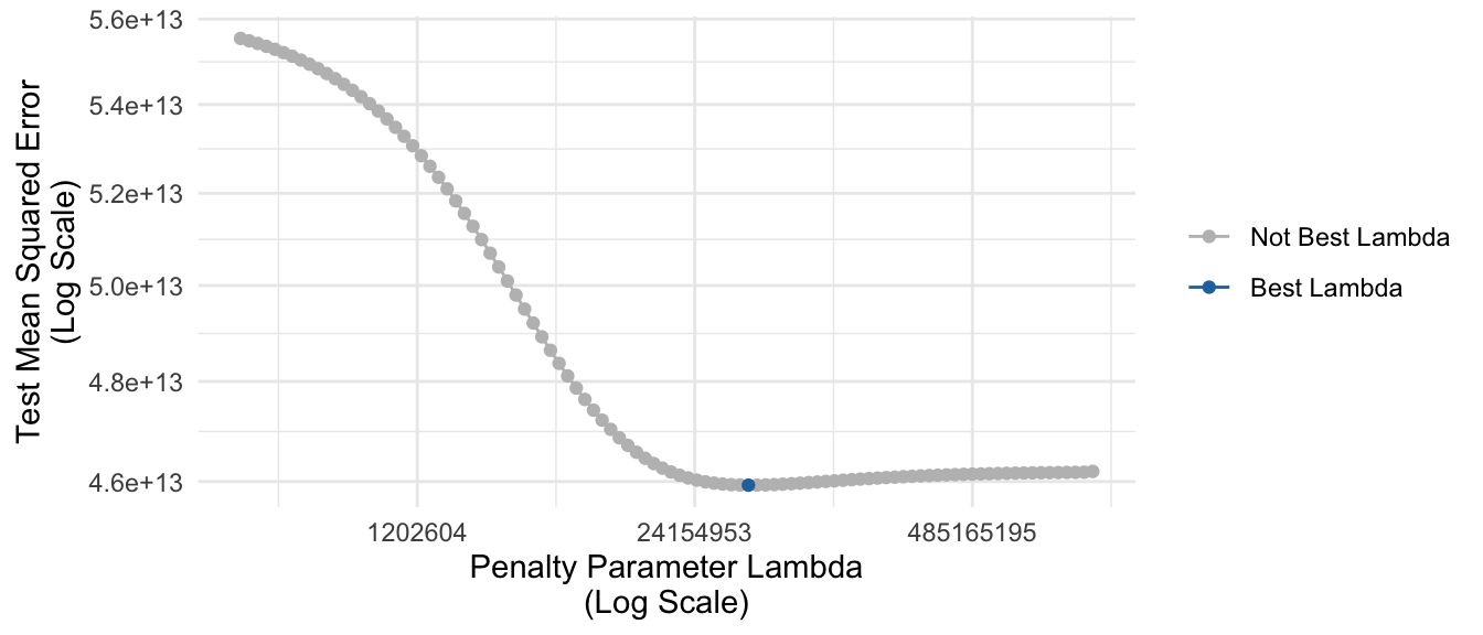 summarize(mse = mean(squared_error))The figure below visualizes these estimates. As the penalty parameter grows larger, predictive performance improves (lower error) to a point and then begins to get worse. The selected best value of the tuning parameter \(\lambda\) is highlighted in blue.