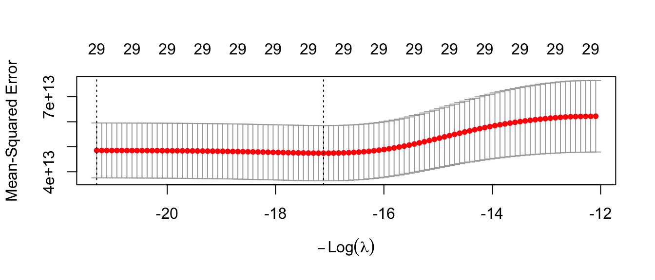 )We can use ridge_regression_cv$lambda.min to extract the chosen value of \(\lambda\) that minimizes cross-validated mean squared error (2.7074931^{7}). We can also visualize the performance with a plot() function.