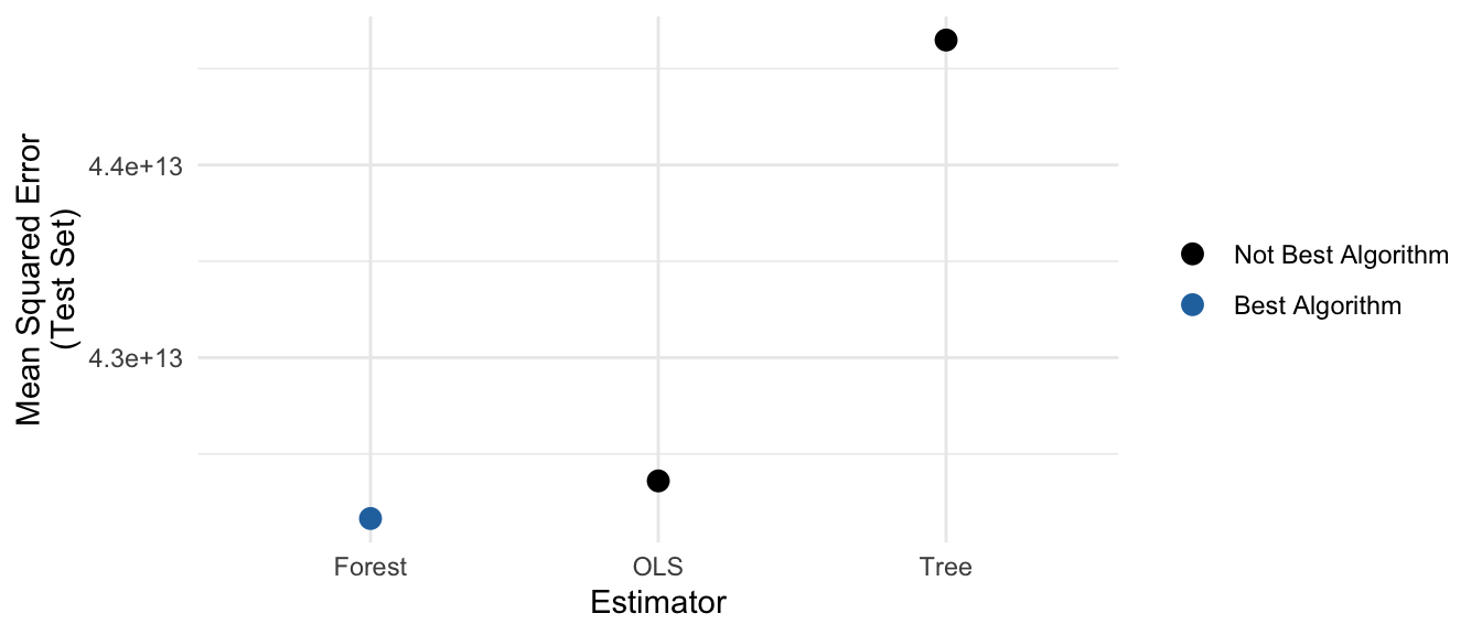 In the example above, we used sample splitting to choose the optimal value of a penalty parameter (\(\lambda\)) within a particular algorithm for prediction (ridge regression). One can also use a train-test split to choose among many very different estimators. For example, we might estimate OLS, a tree, and a forest.