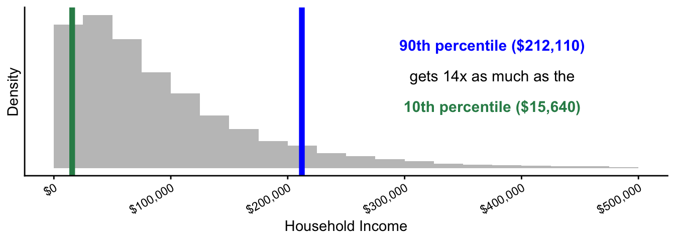 There are two summary statistics: the 90th percentile in blue and the 10th percentile in green. The 90th percentile is the income value such that 90% of households have incomes that are lower. 90% of the gray mass is to the left of the blue line. The 10th percentile is the income value such that 10% of households have incomes that are lower. We can think of the 90th percentile as a measure of a high income in the distribution and the 10th percentile as a measure of a low income in the distribution.