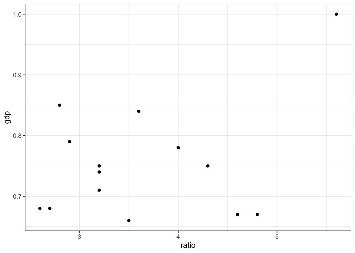 data = table1says that data will come from the objecttable1mapping = aes(x = ratio, y = gdp)maps the data to the aesthetics of the graph. This line says that theratiovariable will be placed on the \(x\)-axis and thegdpvariable will be on the \(y\)-axis.