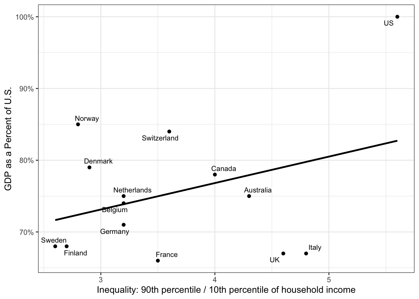 Is economic output higher in countries with higher levels of income inequality? Some argue that this would be the case, for example if high levels of income inequality provide an incentive for hard work and innovation. But is it true?